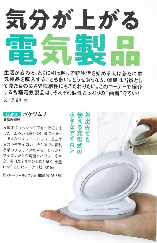 2021年3月16日発売の「モノマガジン 4/2号(発行/ワールドフォトプレス)」にスリーアールグループが企画・販売を手がけるポータブルアイロン「Qurra ポケツムリ」が掲載されました。