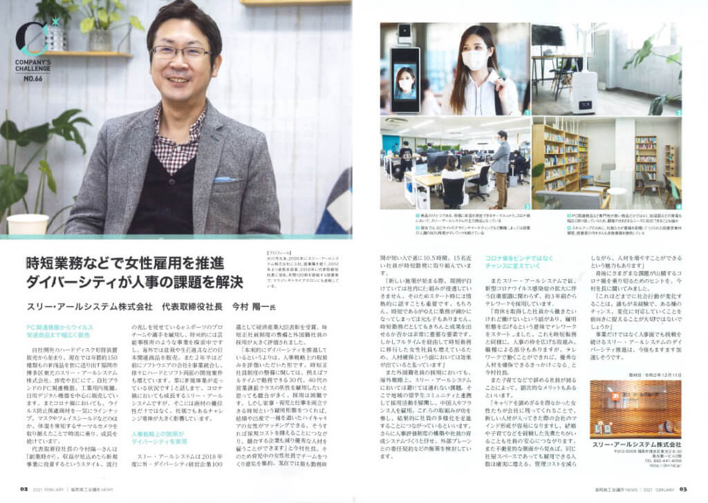 2021年2月10日発行「福岡商工会議所NEWS 2021年2月号 vol.558」でスリーアールグループであるスリー・アールシステム株式会社が紹介されました。