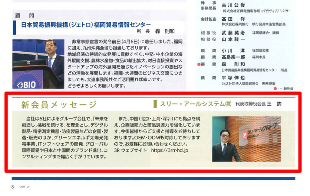 2021年2月発行の「MIRAI No.24」で新会員としてスリーアールグループ会長 王 鈞(おう きん)が紹介されました。