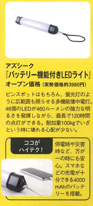 「ASSIKE バッテリー機能付きLEDライト」は、「超ハイテク防災ギア 45」特集の中で紹介されました。